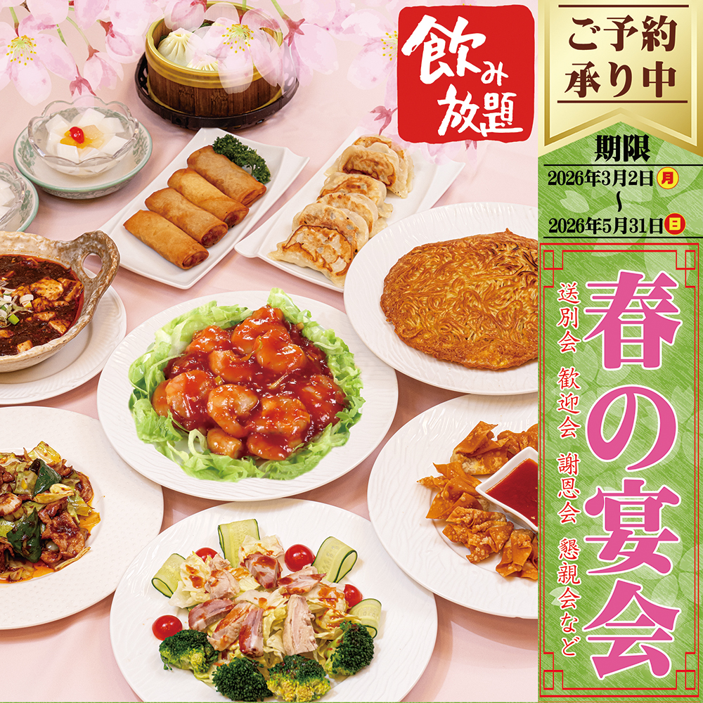 ![]() | 「梅蘭焼きそば」や「エビチリ」「小籠包」などを含む全10品+2時間飲み放題付き|送別会・歓迎会◎料金:4,900円(税込)/1名様 |