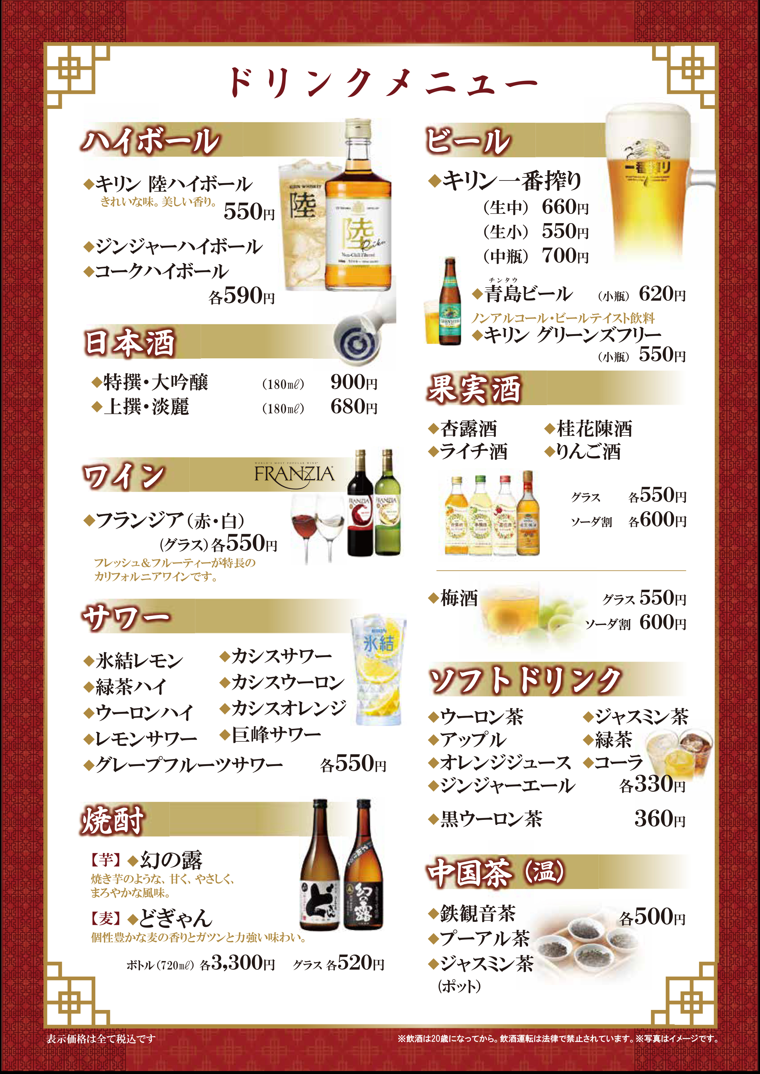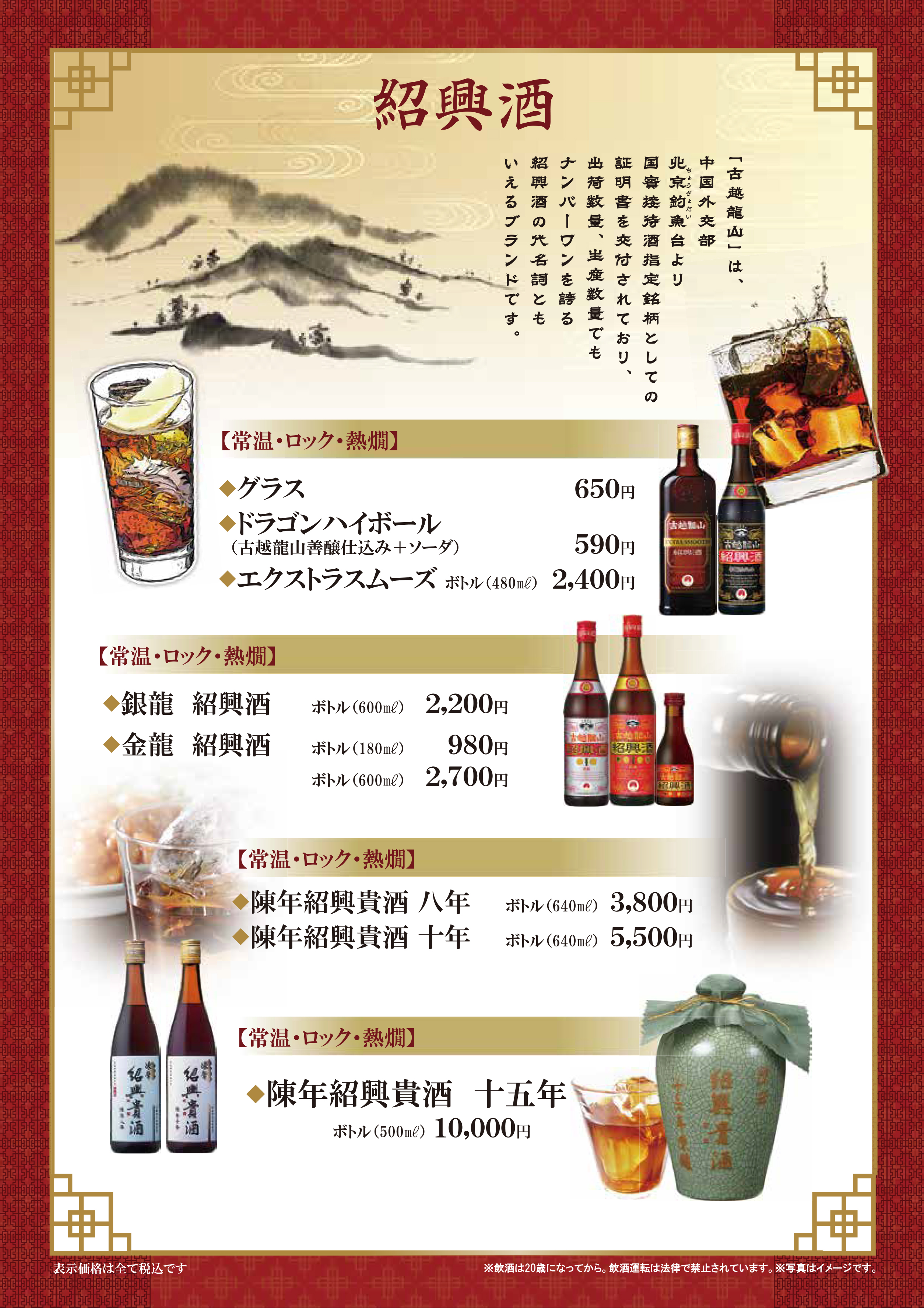 種類豊富なドリンクメニュー ビールを初め、紹興酒、サワー、カクテル、ソフトドリンクなどを含む約30品以上。本場中国の本格紹興酒をご用意! 長期間熟成させた本物の紹興酒の味わいをお楽しみください。★梅蘭センター北店ドリンクメニュー★